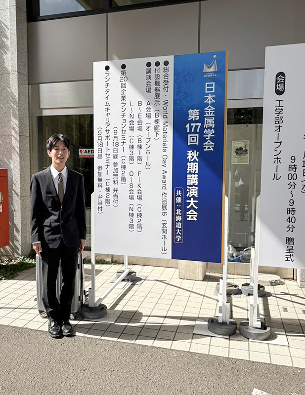 Three second-year master’s students from the Kobayashi Laboratory gave presentations at the 2025 Autumn (177th) Meeting of the Japan Institute of Metals and Materials (JIM) and the 190th Autumn Meeting of the Iron and Steel Institute of Japan (ISIJ), held at Hokkaido University (Sapporo Campus) from September 17 to 19, 2025.